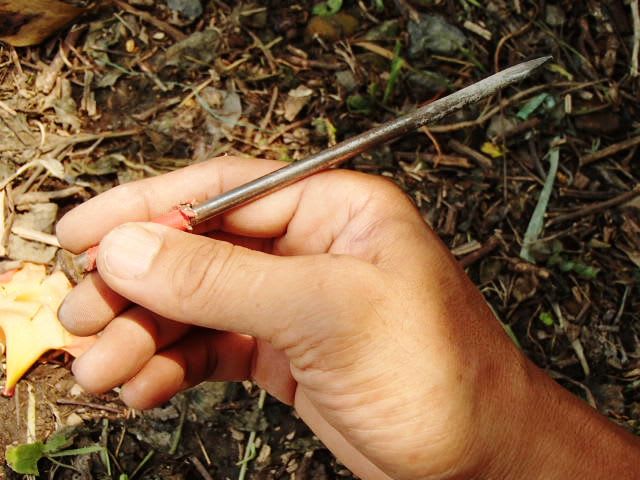 子供の遊びの「釘さし」は、釘を180度回転させるこんな持ち方。手首のスナップだけで釘は飛んでいく。