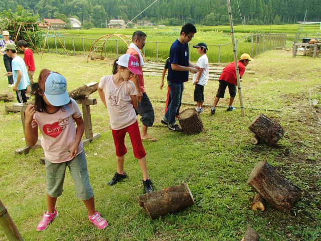 残念ながら記録的豪雨で川遊びは中止になったが、忍者ごっこというノリはそのままに薪割りや竹の楽器作りをして遊んだ。