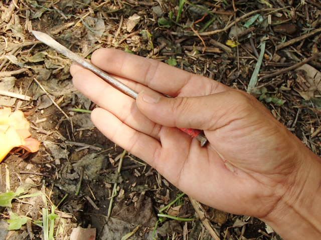 そこでだ、慎重に狙いをつけて命中させる経験と、速度のある動きを併せ持った割り稽古(準備運動のようなもの)を色々考えて、昔の子供遊びの「釘さし」をさせてから薪割りを教えることにしてみた。
