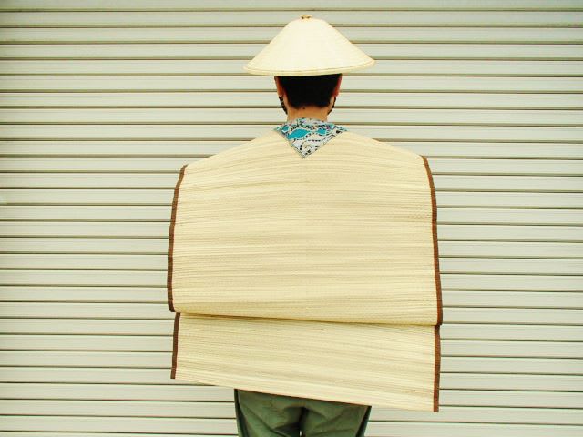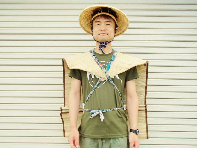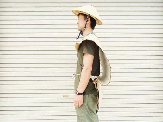 「ゴザ」正面・・・モデルは整体仲間で糸魚川に遊びに来た深畑君。被っている菅笠は、糸魚川市能生谷のお年寄り達が手作りしている丈夫で長持ちの特産品。農協で買える。