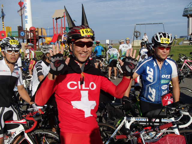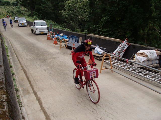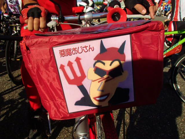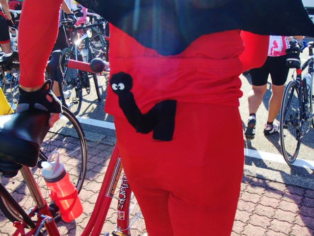 真っ赤だけど普通のママチャリで起伏の激しい120キロを完走する凄い人。悪魔パワーに違いない。