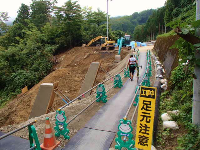 糸魚川は全国有数の地滑り地帯で、今回も海谷渓谷に行く林道が土砂崩れのために災害復旧工事真っ最中で、このイベントのために自転車が通り抜けられるだけの仮舗装をしたのだ。