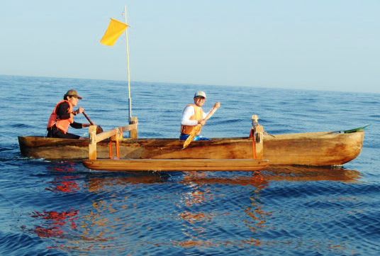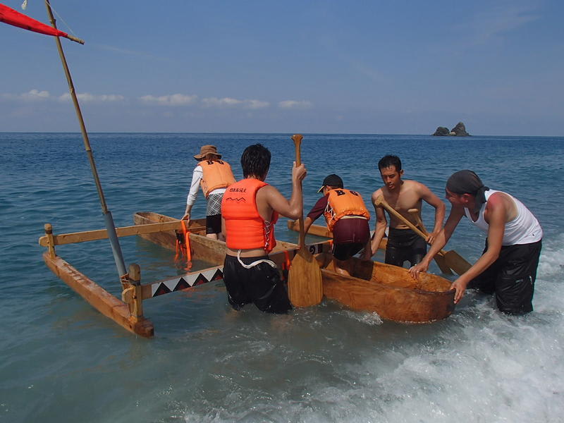 単体胴だと少しでもウネリがあると転覆してしまうので、二隻ともダブルアウトリガーカヌーにして安定性を確保している。