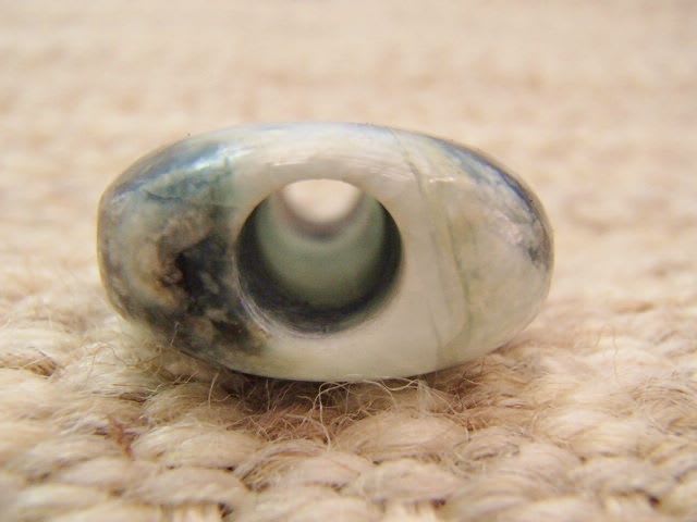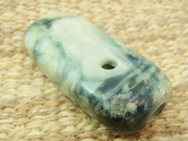 勾玉のように厚み1㎝前後の薄いヒスイに小さな紐孔を開けるならともかく、奥行6㎝もの太い貫通孔を開けてある驚きの技術。
