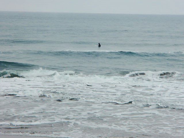 雪が舞うなか、造船所の前で波乗りしているド根性サーファー発見。