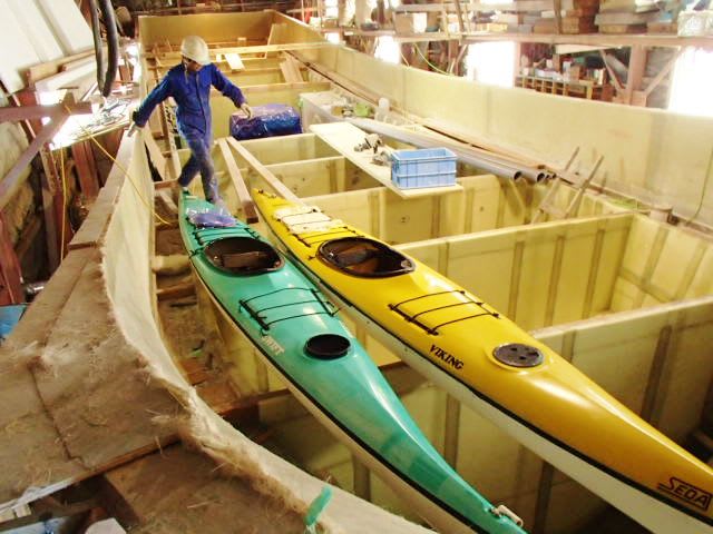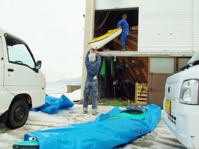 1月18日の土曜日、晴れ間を縫って造船所にシーカヤックを運び込む。
