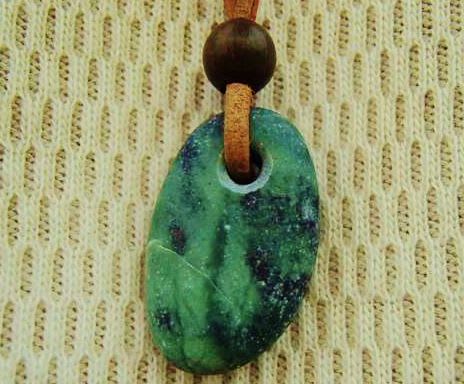 Sさんは鉱物マニアではないし、糸魚川の海で潜った記念にペンダントにしたいと希望したので、帰りにぬなかわヒスイ工房によってペンダントに仕立てたのが下の写真。もちろん研磨はしておらず、孔を開けただけだ。