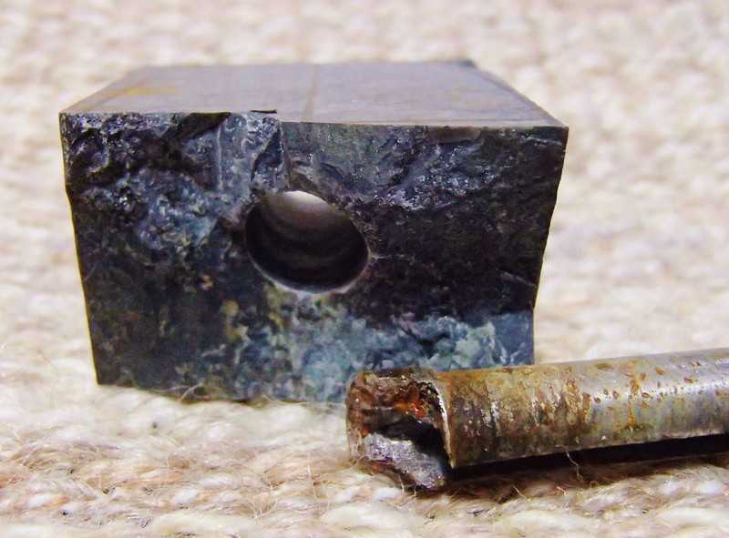 真ん中から割れた泥岩と、破断したドリルの先端。ドリルビットは中国製ということもあるけど、酷使したから疲労破断だろう。ビット供養しなきゃな。