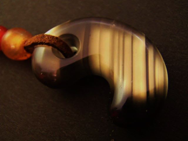 原石は黒い塊だったが、研磨途中で光りを透かしてキズのチェックをしていて気づいたのだけど、黒一色の黒曜石に縞模様が入っていた。