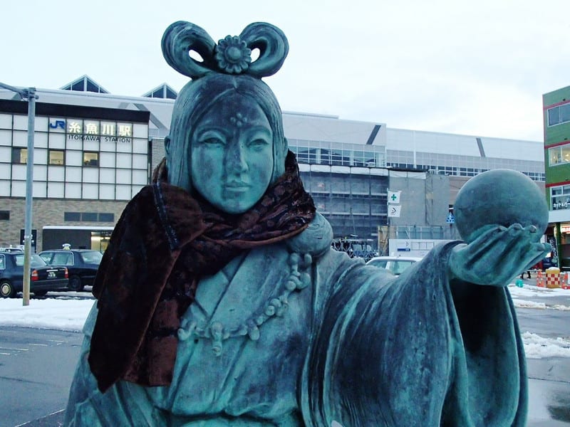 新幹線駅の工事で雑然とする駅前を歩いていたら、奴奈川姫の銅像にマフラーがしてあった。