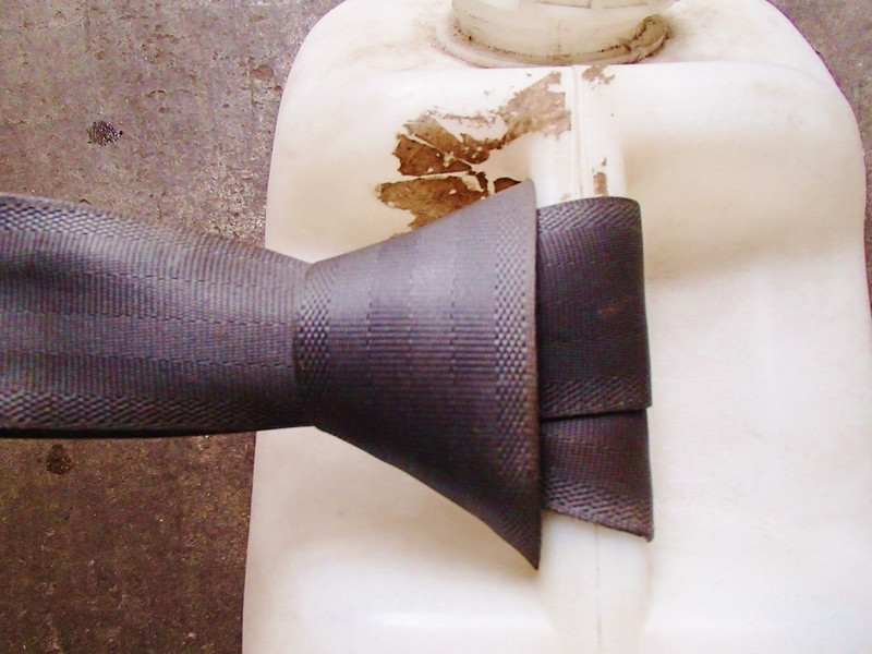 ポリタンへの固定は、輪っかにしたシートベルトを取っ手に通して、再び輪っかをくぐらせるだけのクラブヒッチ。