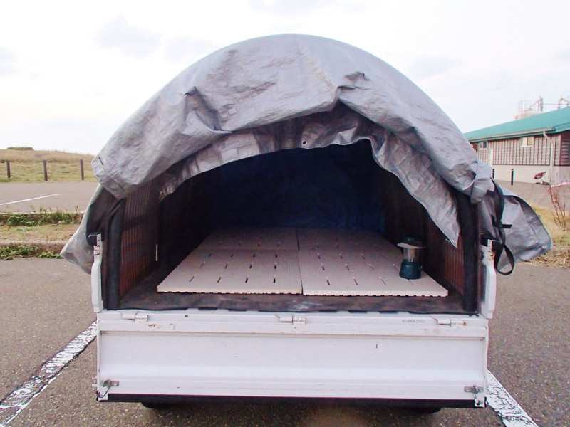 こいつを4枚並べると軽トラの荷台に丁度うまい寸法に収まってくれるので、カップルでも寝るスペースが確保できる(と思われる・・・笑)。
