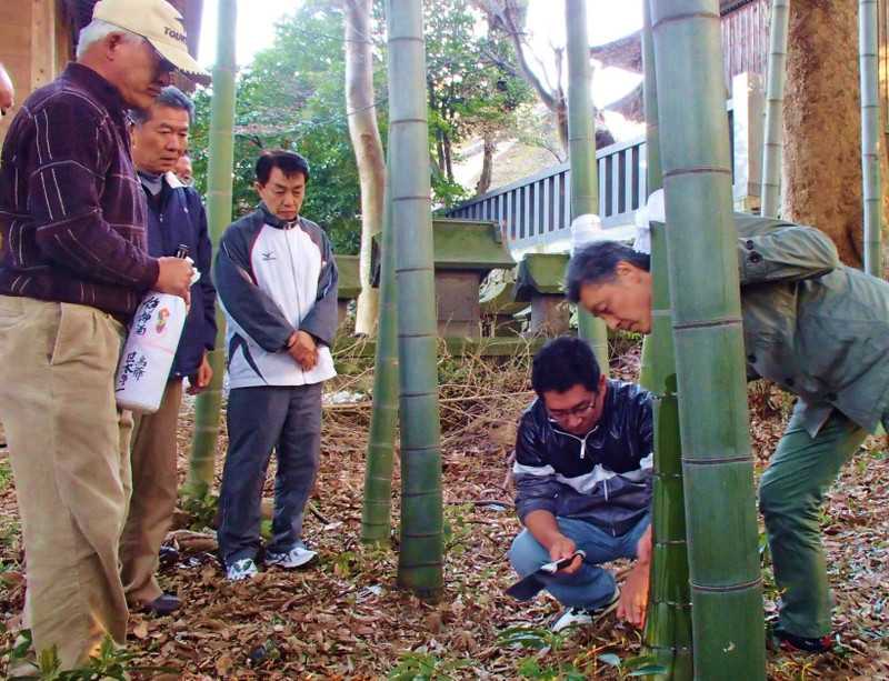 ③目星の竹にお神酒でお浄め後、最初に鶏爺が竹に土下座してから鋸を入れる。