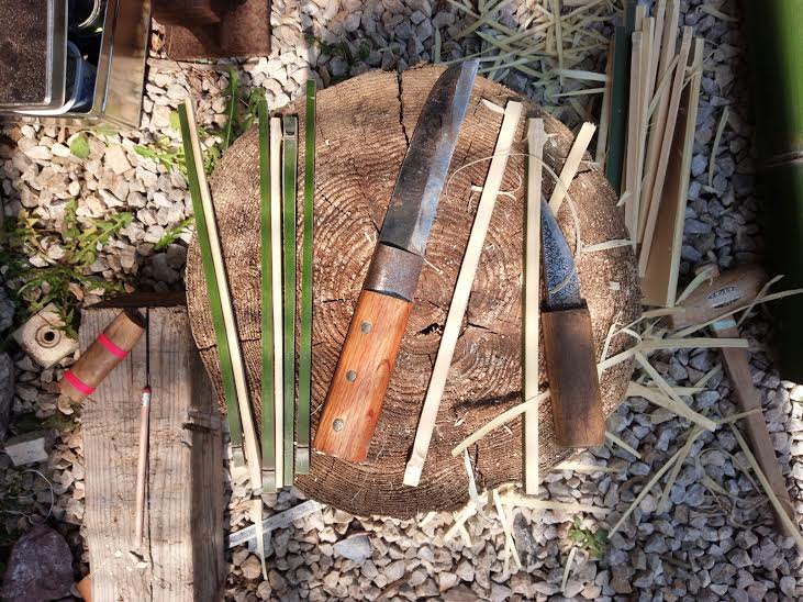 竹を割って、削って、ヤスリを掛けて、焙って油抜き、天日乾燥の手順。