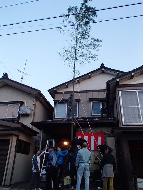 ⑥青竹を有志がワッショイと囃しながら歩いて鶏爺の自宅まで運び、立てる。