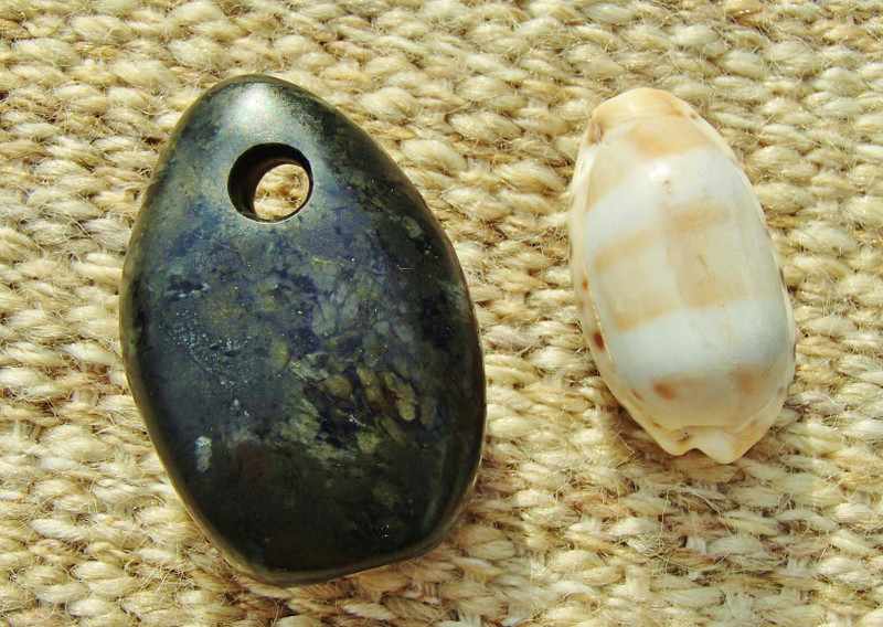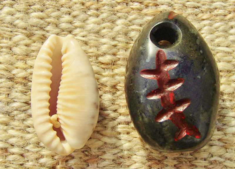 左がモデルにした宝貝で、沖縄の海で拾ったもの。