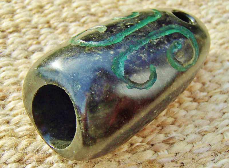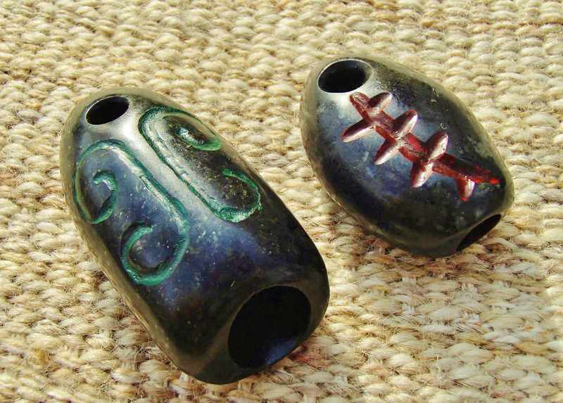 今回は、蛇紋岩作った御物石器型の石笛に色漆で彩色してみた。