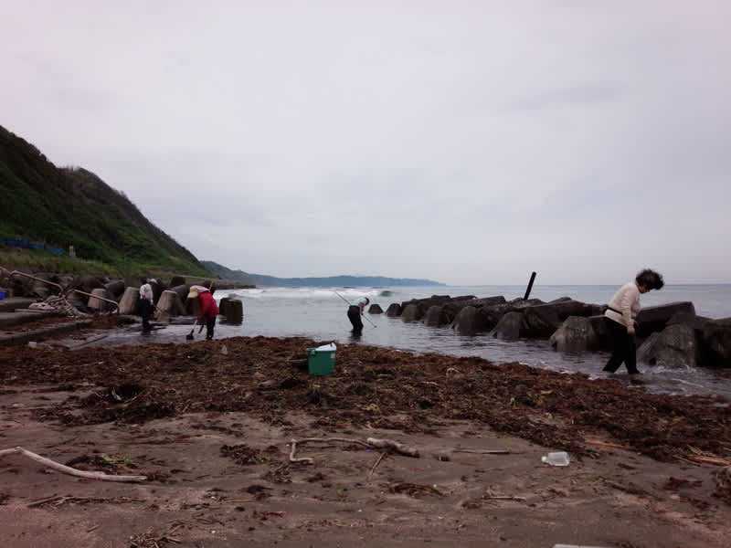 同じワカメ漁でも、砂浜の寺泊山田海岸では、打ち上げられたワカメを採っていた。