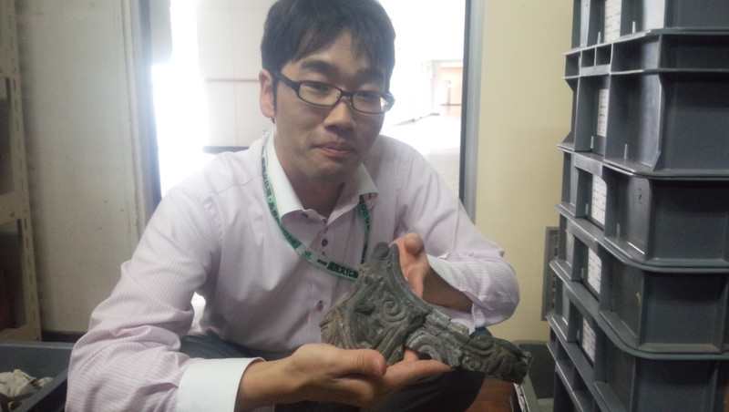 博物館には展示していない石棒と、火炎型土器の破片を男鹿市の収蔵庫で特別に見せて頂いた。