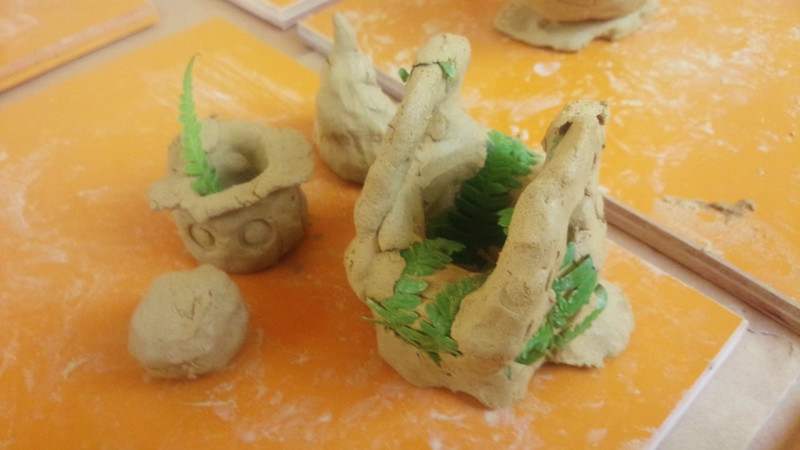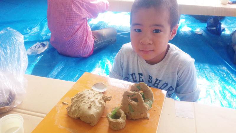上の写真の子供の作品。不思議なオブジェが出来たが、粘土に隙間が多く複雑な形状なので、野焼きすると割れてしまうだろう。