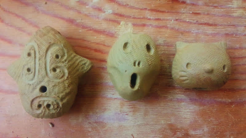 左から東北から出土している海獣形土笛をモデルにしたオカリナで、簡単なデザインなら誰でも作る事ができるのだ。