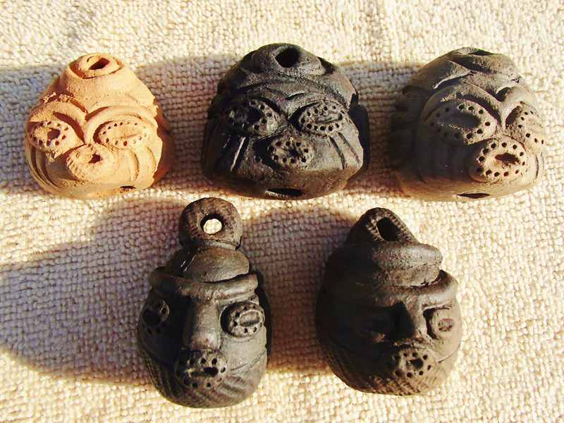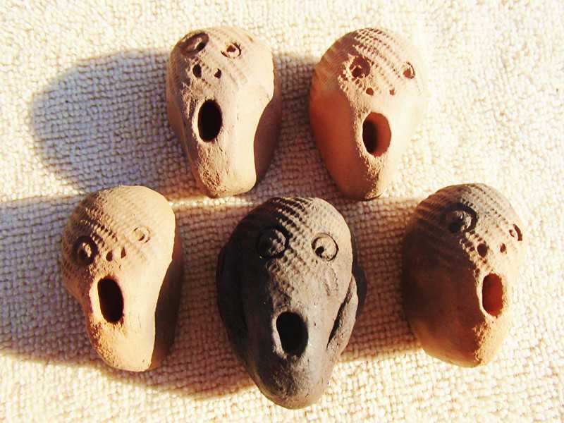 叫び!・・・中央の黒い土笛は、焼成の後に「炙り焼き」という炭素を吸着させた技法によるもの。縄文晩期(三千~二千五百年前)に流行る焼き方で、当時は焼成直後の熱い土器を松葉などに包んで行っていたと推定されている。