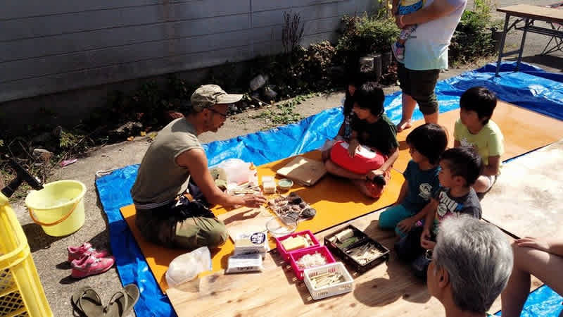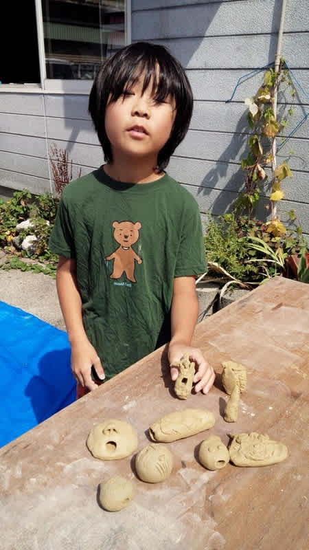 日曜は、友達の赤野さん一家を中心に、子供たち相手の縄文土笛つくりの教室。