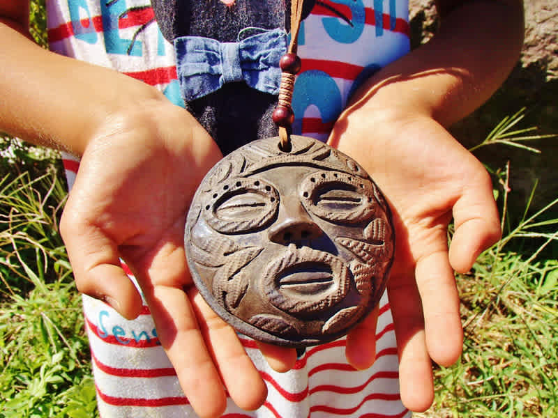 縄文晩期(三千~二千五百年前)の秋田県能代市の麻生遺跡出土の土面をモデルにした縄文オカリナ。