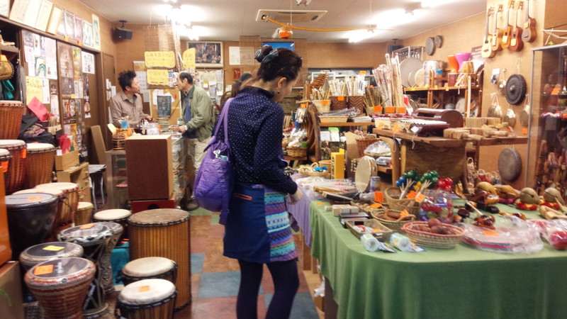 コイズミさんの店舗は、オーケストラ用楽器から100円で買える素朴な楽器まで所狭しと楽器が並ぶ愉しいお店。