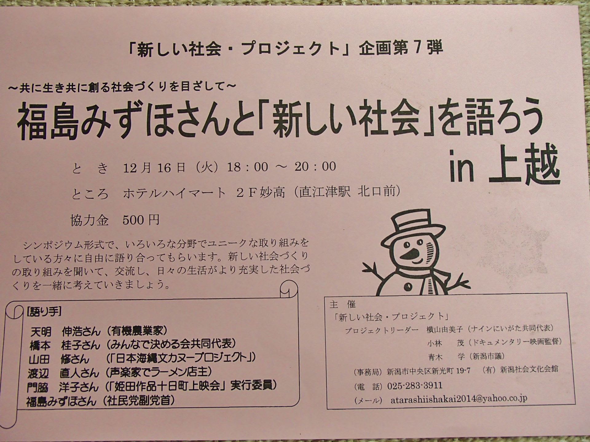 知人の市議会議員から、隣の上越市で開催されるシンポジュームのパネルディスカッションに出て欲しいと頼まれた。
