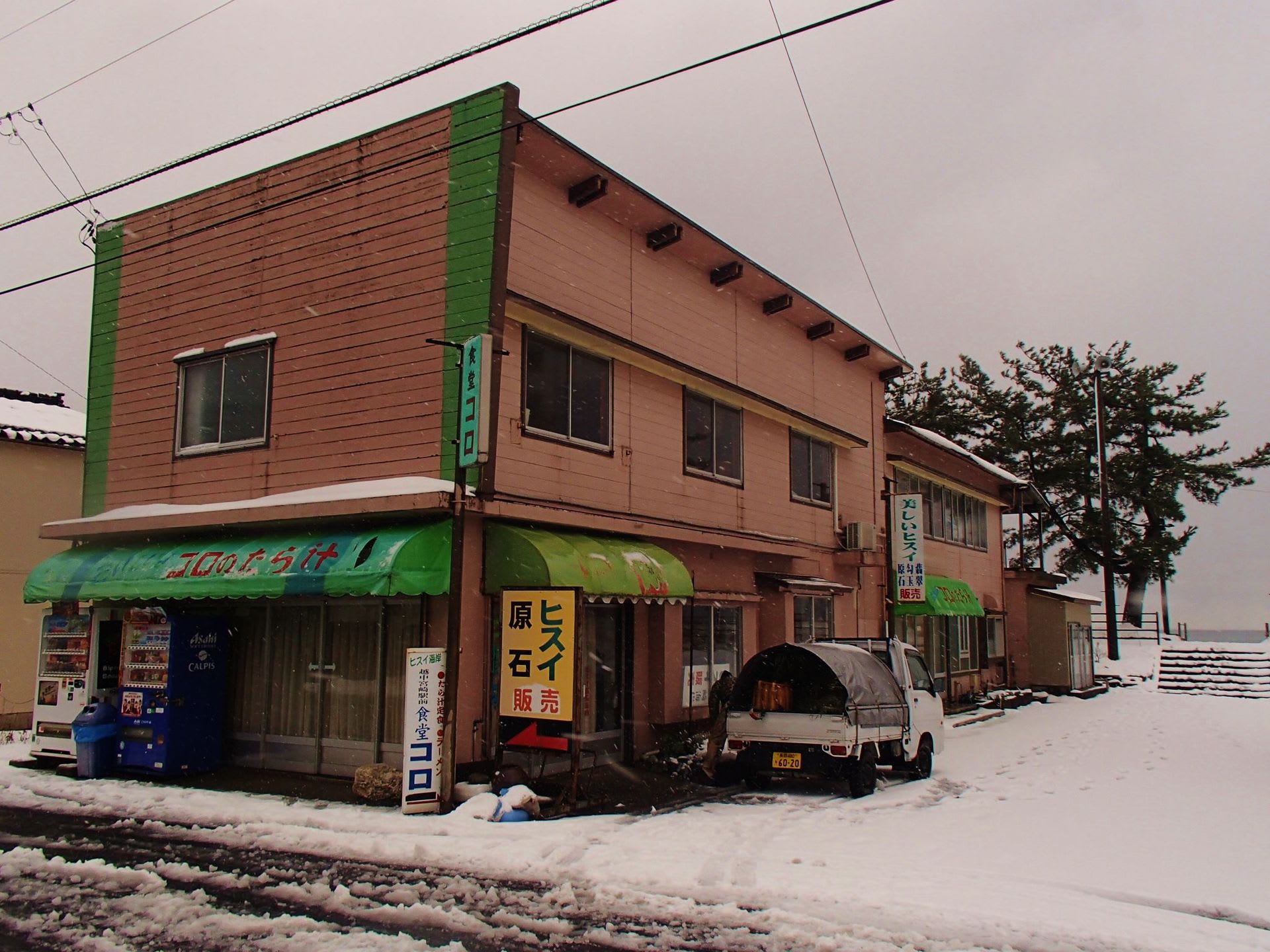 越中宮崎駅前で海岸へのアプローチにある「食堂コロ」は、現在は「ストーンワールド」という鉱物販売店になっている。(土日のみ開店)