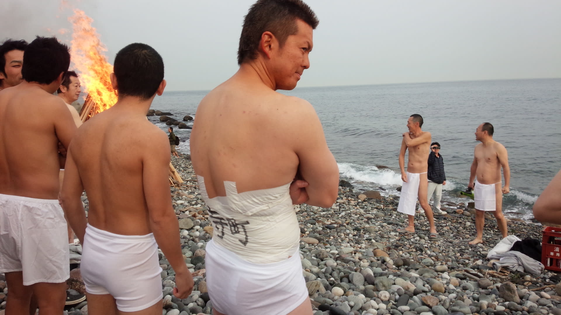 祭り当日の禊は、雪解け水で冷たい日本海にザブリと入る。