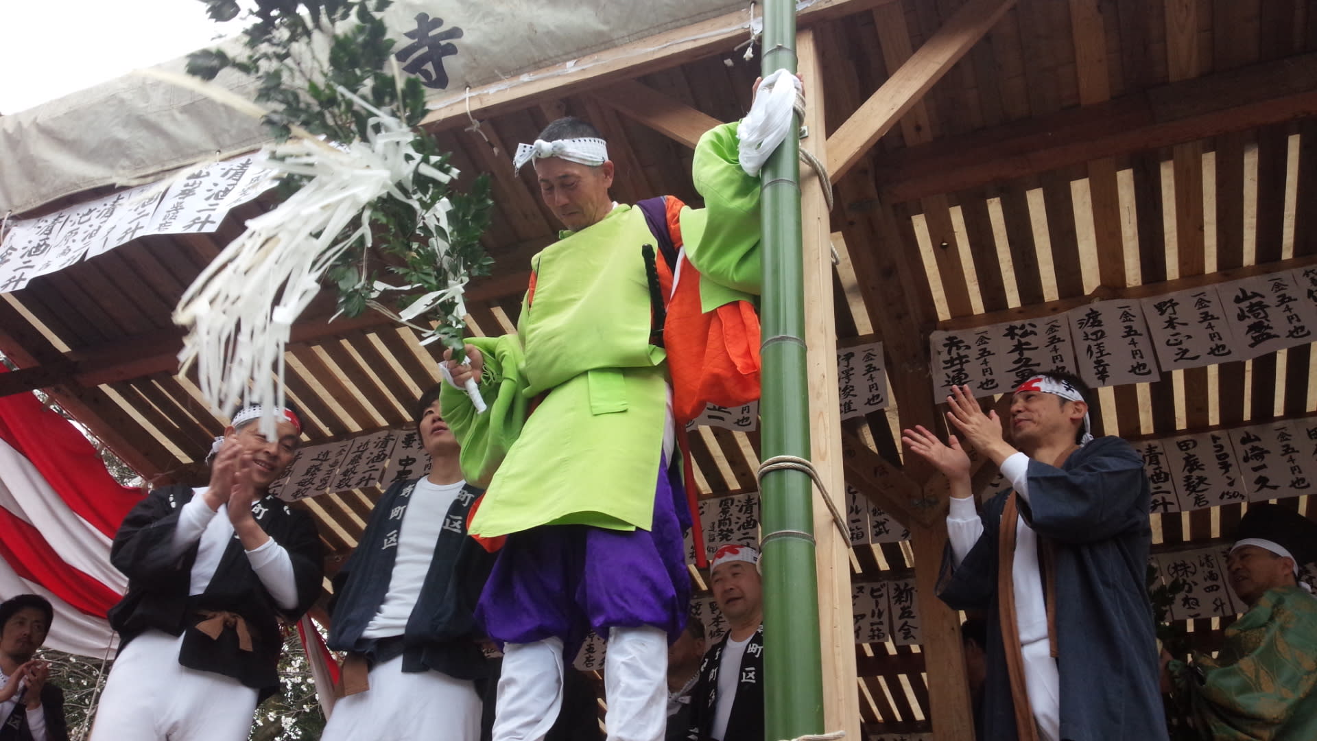 私はジョウバ(除魔・神の到来を告げる魔除けの獅子)の中でも「使い獅子」という、お宮に駆け込んで寺町区の登社準備を楽頭さんに告げる役に就いたが、参道の石段を飛び越えて「おお~っ!」というドヨメキを起こしたものの、実際には太もも裏の筋肉が吊って転びそうになった。