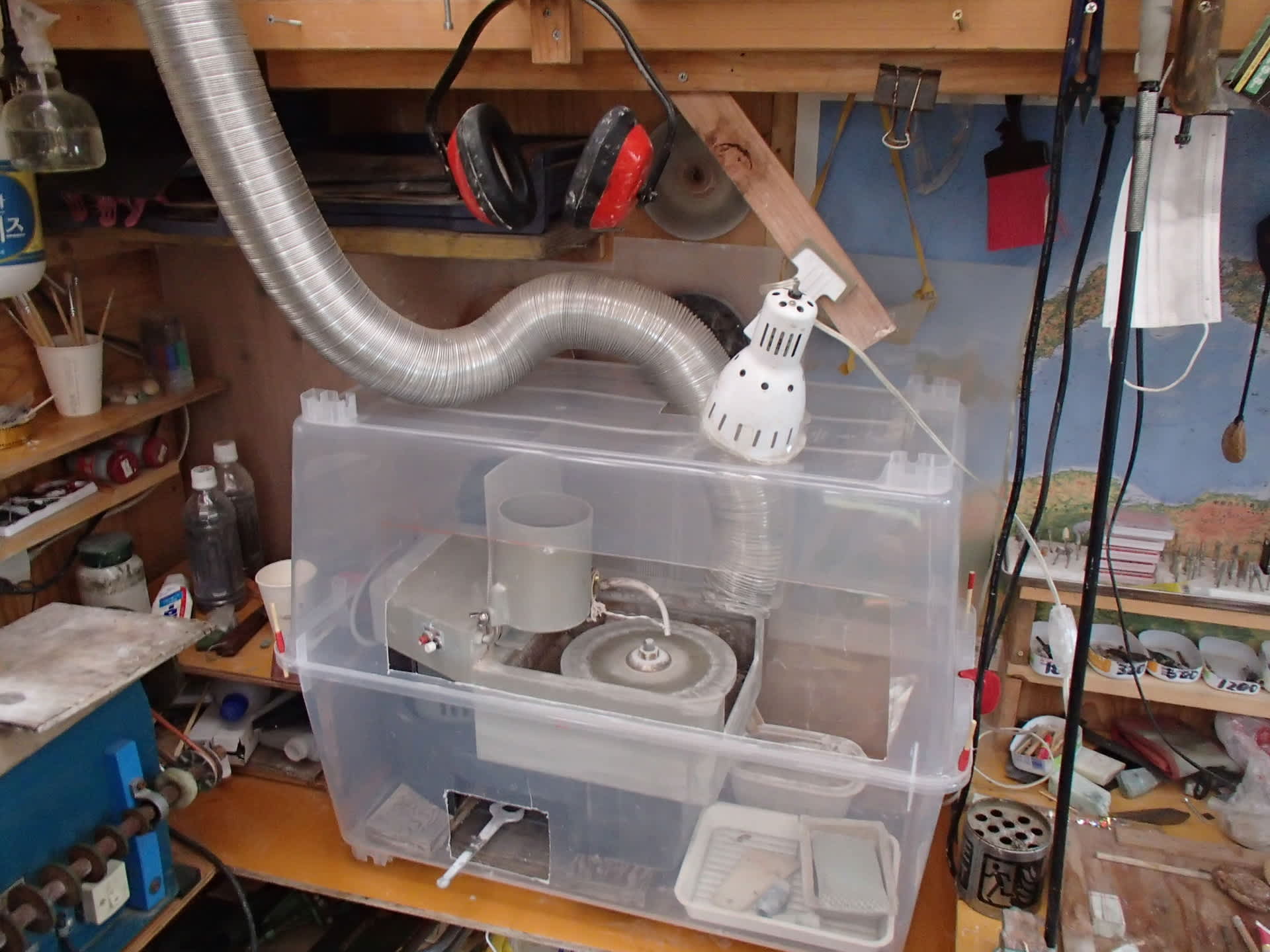 総工費1,000円!プラスチックの衣装ケースを上下に重ねて簡単に固定してあるだけ。集塵機も仲間から只で貰った送風機を逆向きに取付けてダクトを接続してあるだけだが、効率はいい。現在は更にバージョンアップしてある。市販の機械を覆うタイプの集塵カバーセットなら何万円もするのだぞ。