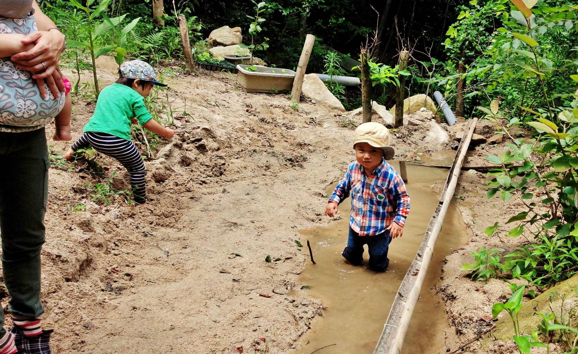 水場があるとこんな微笑ましい風景が観られてヨロシイ。ベージュ色の真砂(マサ)は、粒度が粗いので汚れても乾くとパラパラと砂粒が落ちてくれる。