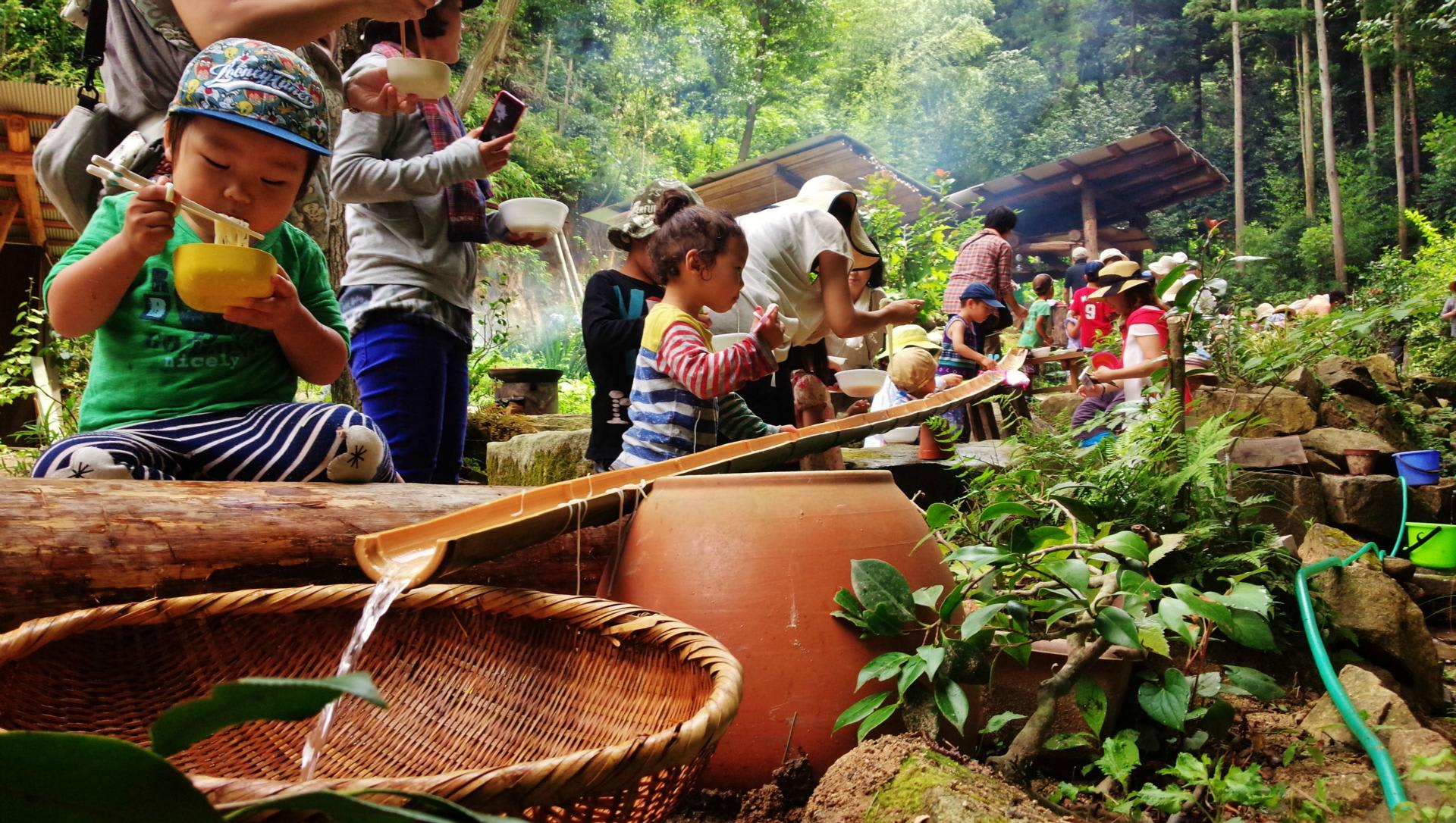 豊富な湧水があるから、10m以上もある流し素麺だってできる。素麺の他にブルーベリーやミニトマトが流れてくる「美鈴の杜特製素麺」
