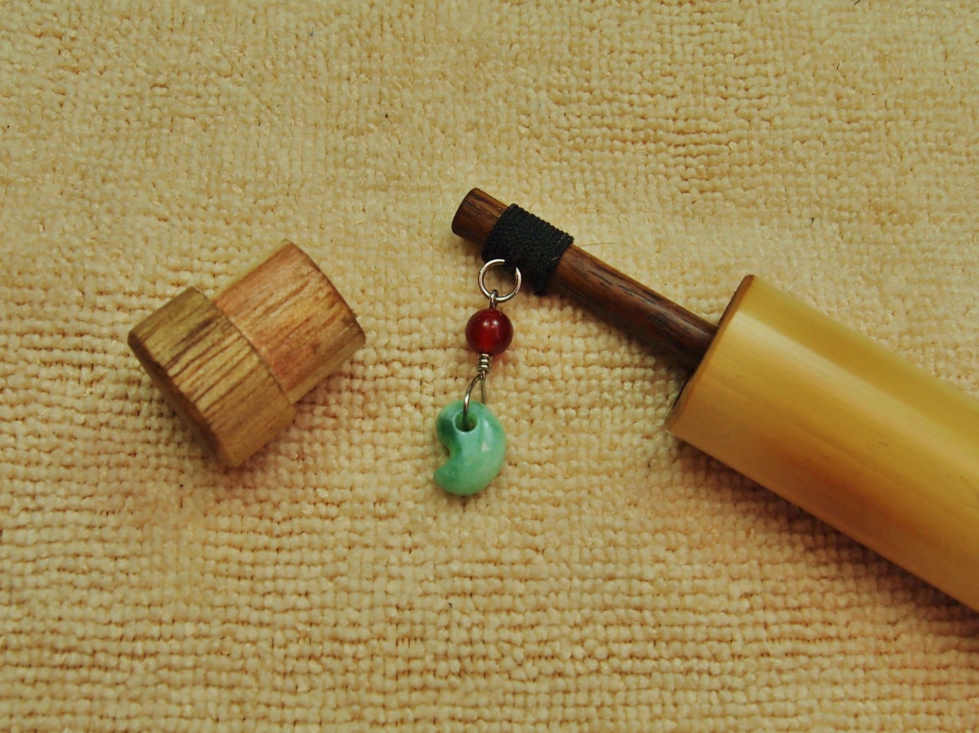 キャンディーのようなとろけそうなヒスイで勾玉を作った。本体はチーク材の削り出しだ。木製部分も外注に出さないのが「ぬなかわヒスイ工房」流でR!