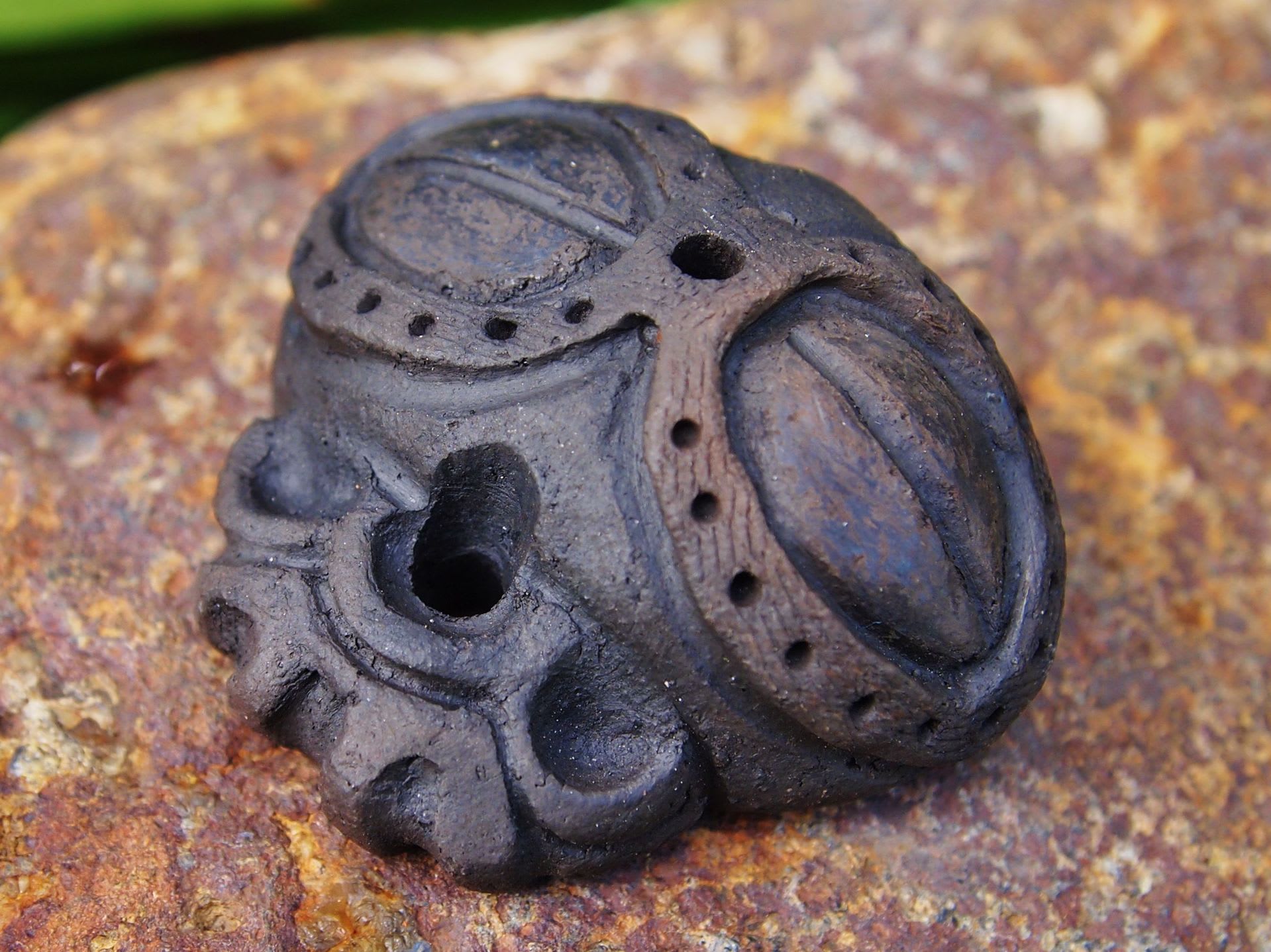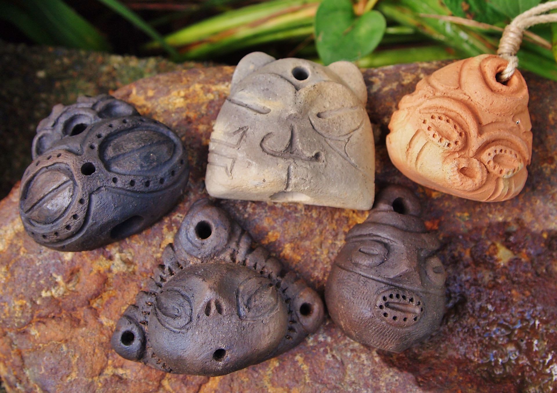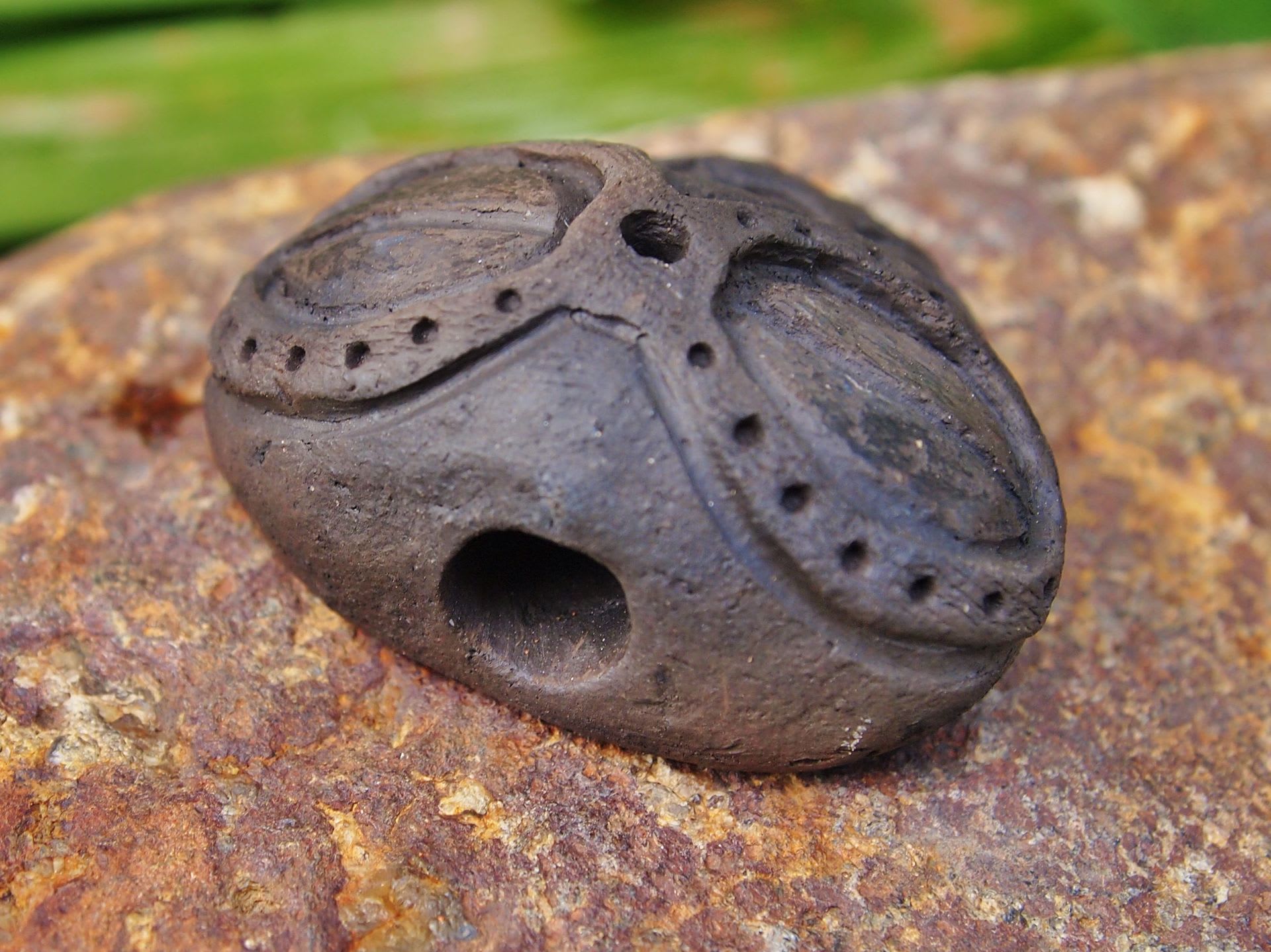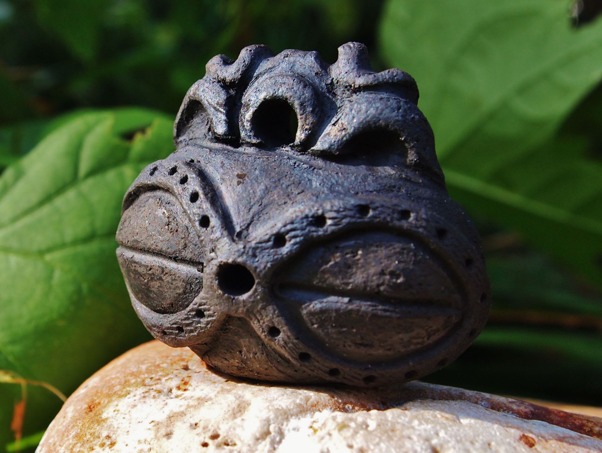 ちゃんと吹き易い形状に作ってある。眼の間に指孔があるが、実物も同様に孔が開いているのは焼成時に割れない工夫か?