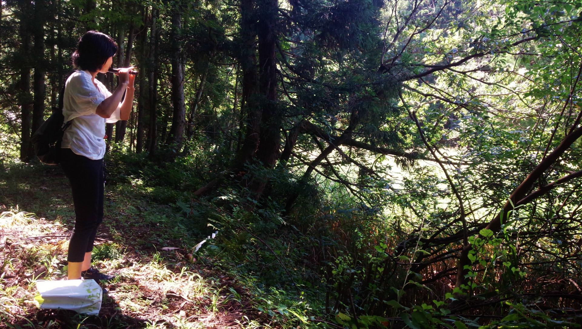 稚児ケ池に到着すると、神主である彼女のご主人が作った御幣を池の端に立て、彼女は祈った後に愛用の龍笛を奏でた。
