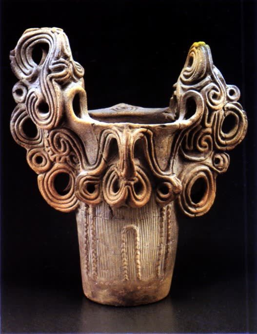 上野の国立博物館に展示されていた縄文土器に出逢って、「なんだ これは!」と衝撃を受け、以降は著述活動で縄文の芸術性を高らかに謳い上げ、また彼自身の作品に大きな影響を受けていく。