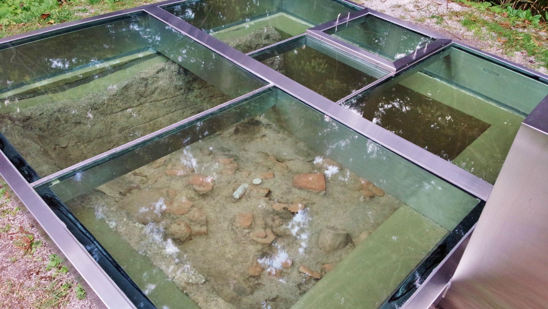 土器捨て場のアップ。壊れた磨製石器や土器が折り重なっている。