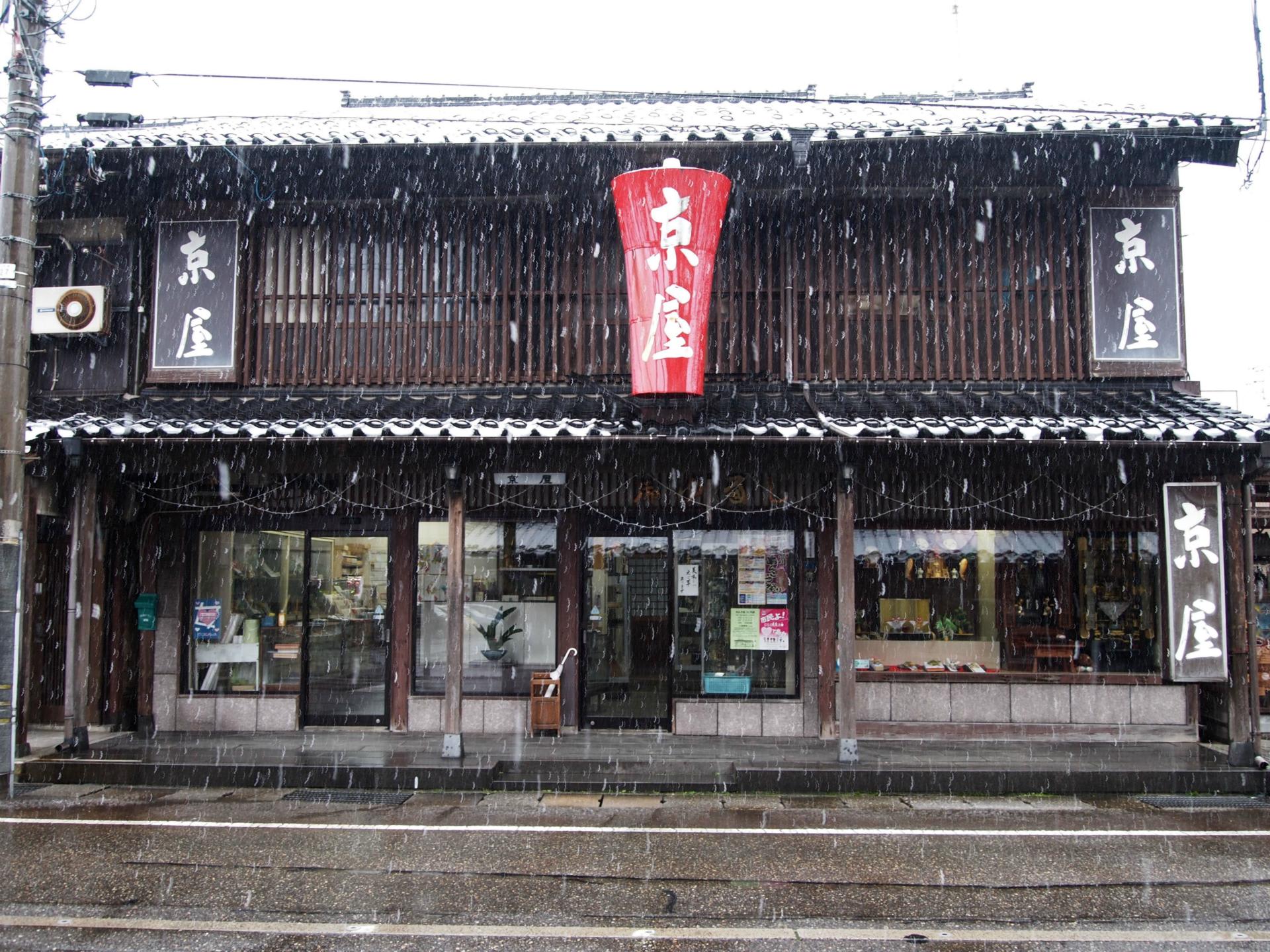 久し振りに雪が降って冬景色になった。本町通りに並ぶ雁木通りは上越市が発祥とされる江戸時代からある木製のアーケード。雪が似合う。