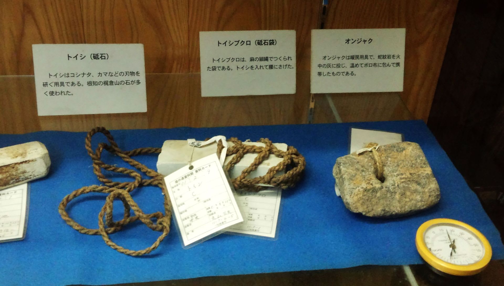 根知区の「塩の道資料館」で、塩を担いで信州まで運んでいた歩荷(ぼっか)の携行品として、蛇紋岩製の温石が展示されていたのだ。