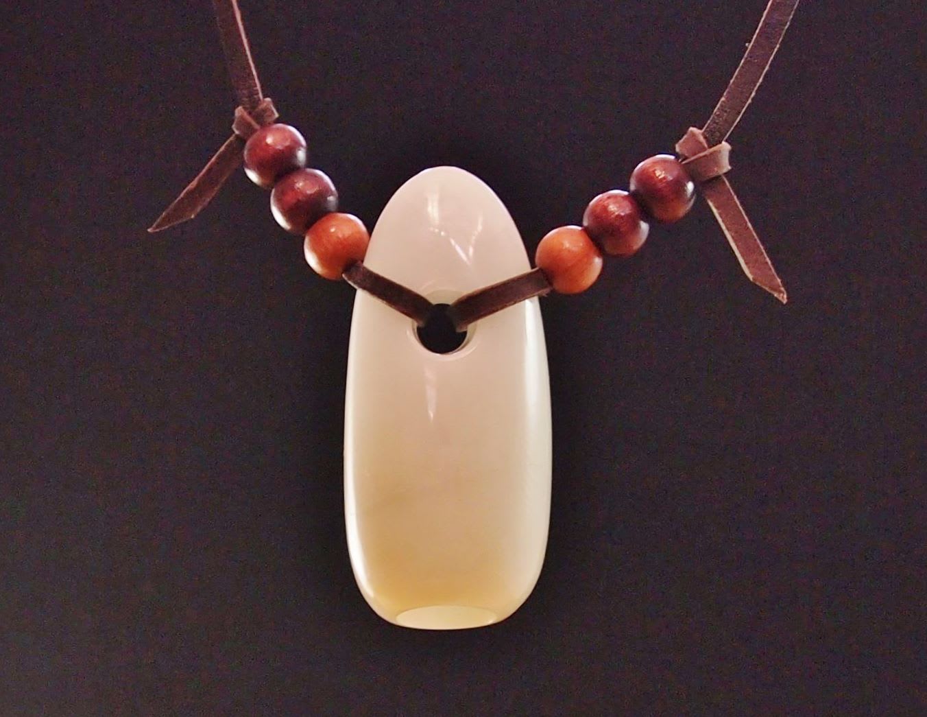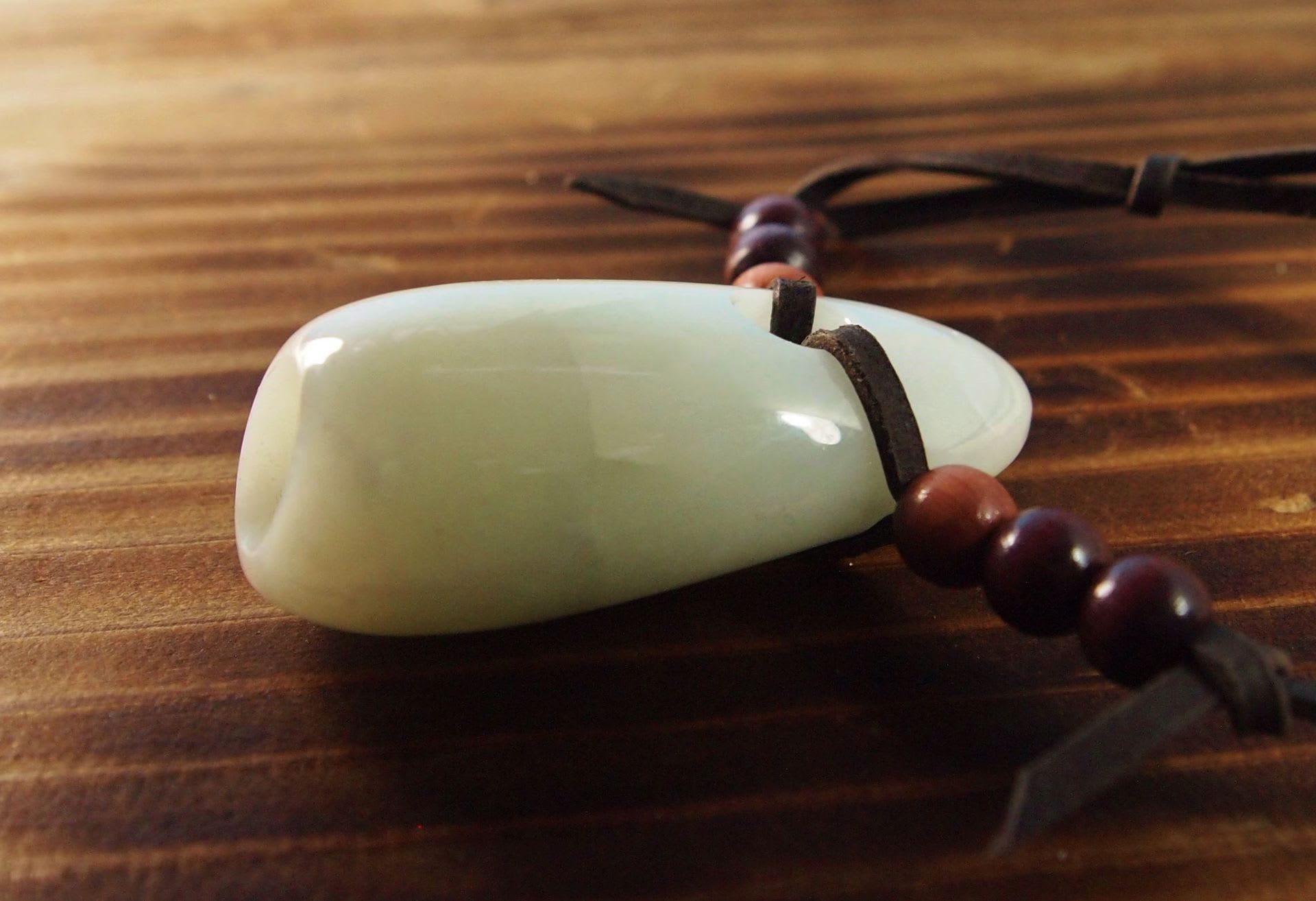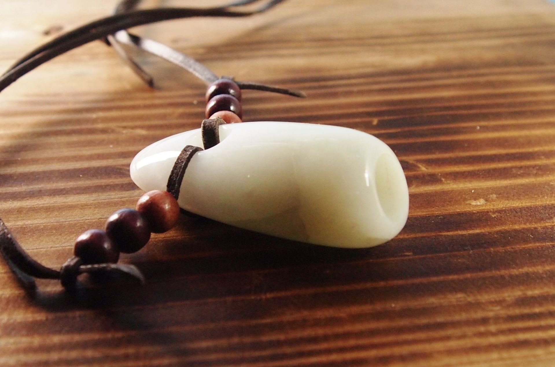 白ヒスイの奥行がなんとなく表現できてきた大珠形の石笛写真。成否はライティングですな。因みに大珠とは縄文前期(六千~五千年前)に作られ始めた威信財・祭器である。シンメトリックに作ってしまうと面白味がない形状だし、縄文に匂いがしなくなるので作るのは意外に難しい。