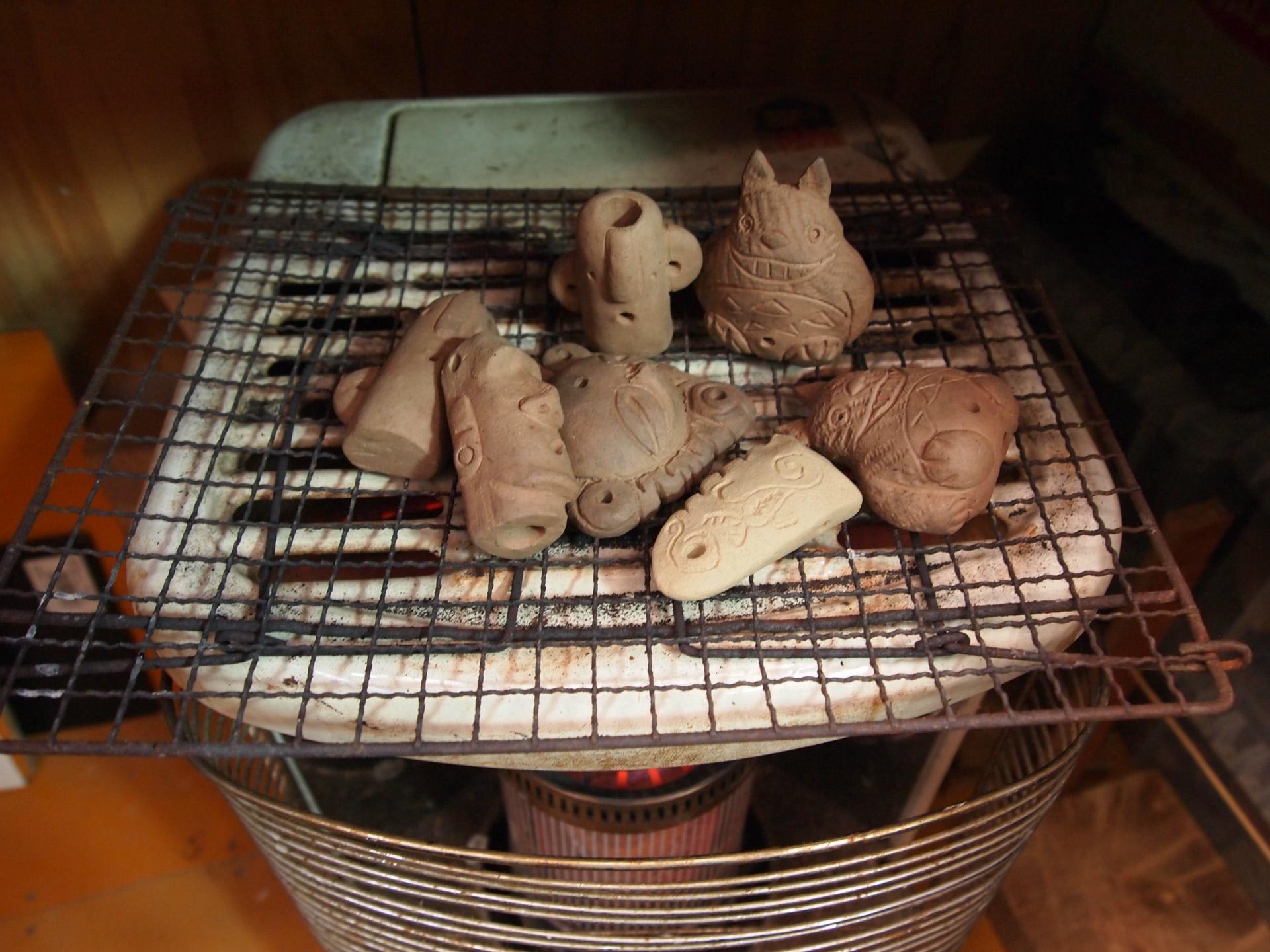 縄文土器の場合は焚火の周りに土器を置いて炙り焼きするのだが、縄文オカリナは小さいのでストーブの上に置いての炙り焼きだって可能だ。