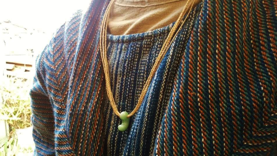 奥様のように勾玉の腹の凹んだ方を前にする仕立ては古墳時代の埴輪がそうなのだが、国産大麻を自分で寄り紐を作ってそのまま数本を紐孔に通しておられるのである。格好いい!