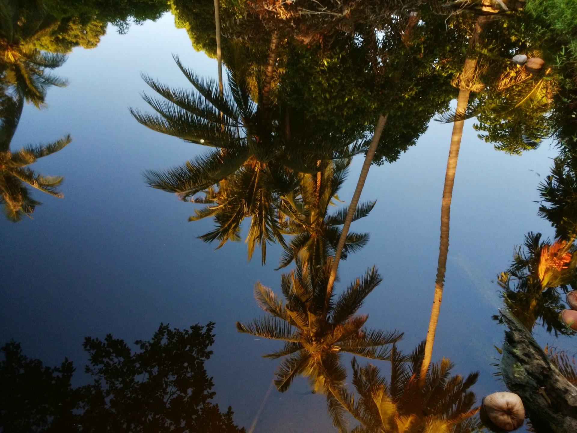 コテージ近くの泉に写った椰子の木。同じアングルで何回も撮影したのだけど時間によって水面の写り具合が全然違うので面白いのだ。