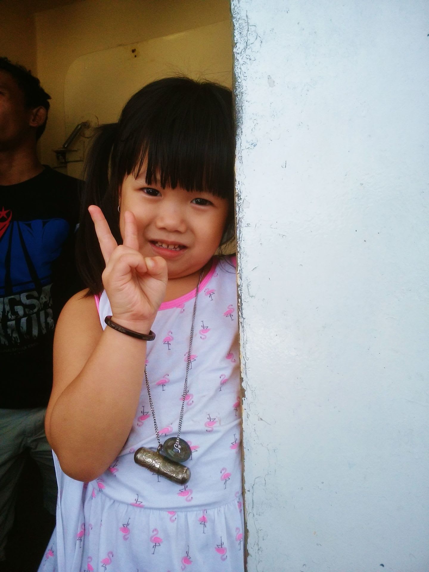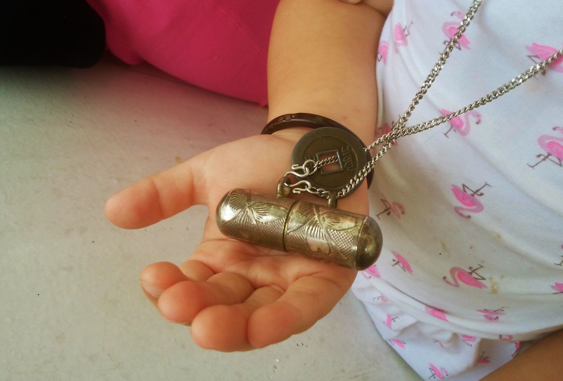 華僑の女の子がしていた中国銭とタビーズ。民俗資料としてタビーズだけの撮影を頼んだ積もりが満面の笑みでピースしてくれた。