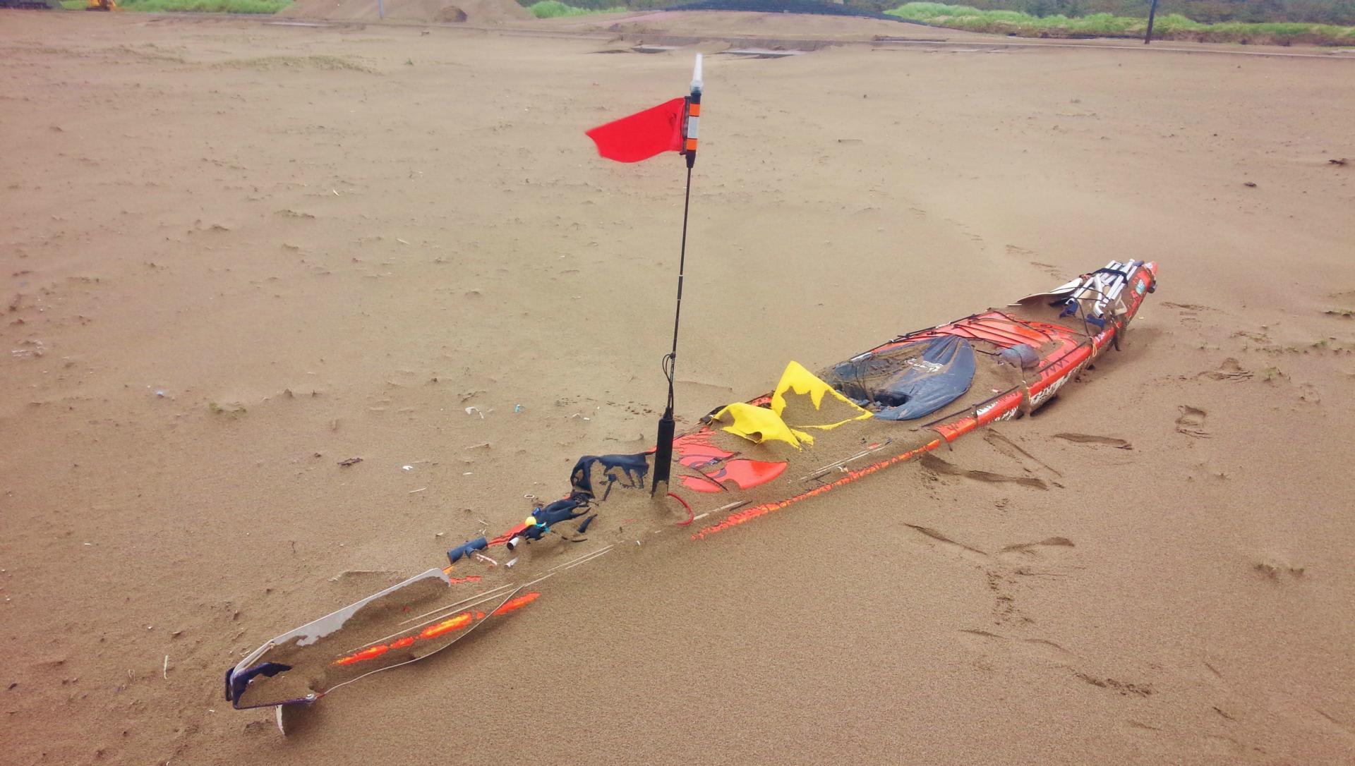 講演会の時は必ず最初に使う写真。「海のヒスイ・ロード」実験航海の時に、秋田県由利本荘で遭遇した砂嵐に、たった二時間で愛艇が砂に埋もれてしまった時の状況。