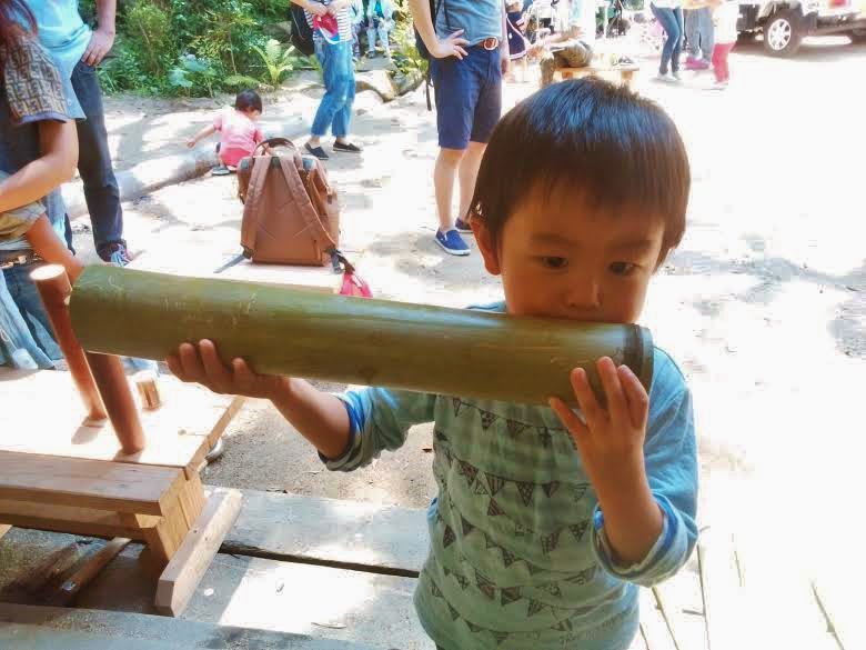 こんな小さな子供でも十分ほどで竹ボラを吹けるようになるのだが、大人の方が難しいのよ(笑)